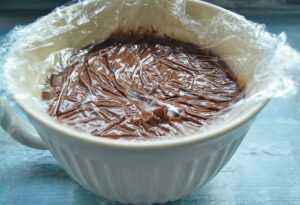 Die Nougat-Pudding-Creme in eine Schüssel füllen und den Pudding sofort mit einer Frischhaltefolie bedecken, damit sich keine Haut auf dem Pudding bilden kann. Den Pudding bei Zimmertemperatur 2-3 Stunden abkühlen lassen.