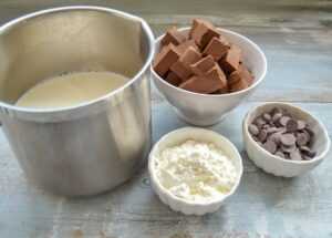 Die gehackte Schokolade und das in Stücke geschnittene Nougat unter die heiße Puddingcreme rühren.