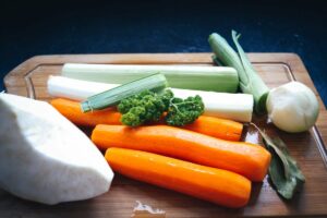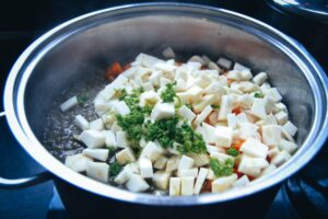 Sellerie, die Möhren und die Kartoffeln gleichmäßig würfeln. (Porree) Lauch halbieren und dann in Stücke schneiden. Die Zwiebel grob würfeln.