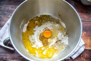 verteile das Wasser zu gleichen Teilen in einer kleinen Schale und verrühre in der einen das Hirschhornsalz und in der anderen die Pottasche. Wundere dich nicht, das Hirschhornsalz riecht etwas beim Auflösen. Dies ist ein Zeichen, dass es frisch ist und einen guten Backtrieb hat. Gebe das Ei zum Teig und das Pfefferkuchengewürz und die Flüssigkeiten mit dem Backtriebmittel mit dem Teig. Da der Teig recht zäh ist, solltest du ihn am besten mit der Küchenmaschine rühren. Wenn der Teig sich vom Knetharken oder deinen Fingern gut löst, ist er fertig. Decke den fertigen Teig mit einem Tuch ab und lasse den Pfefferkuchenteig 3 Stunden bei Zimmertemperatur ruhen.