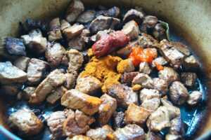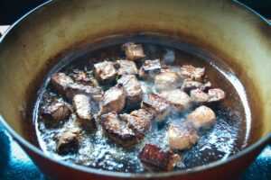 Das Öl oder Schmalz in einem großen Topf erhitzen und das Rindfleisch portionsweise darin anbraten,