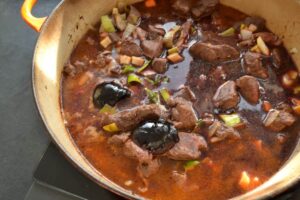 Nun mit dem Rotwein, eingeweichten Steinpilzen und dem Pilzwasser und dem Wildfond auffüllen und ca. 90 Minuten auf kleiner Flamme köcheln