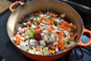 Als Nächstes kommt das klein geschnittene Suppengemüse dazu, das Tomatenmark darunter rühren und alles 5 Minuten braten lassen.