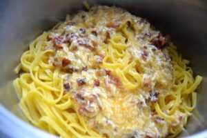 Etwas vom Nudelwasser ca. 50 ml mit der Käse / Eiermischung verrühren. Die Nudeln aus dem Wasser nehmen und unter die Eier/ Käsesauce heben. Zum Schluss den Bacon mit dem Fett aus der Pfanne zu den Nudeln geben und gut unterheben.