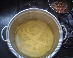 Für die original Spaghetti Carbonara, die Nudeln nach Anweisung auf der Packung kochen und in der Zwischenzeit die Carbonara zubereiten. Die Spaghetti im Salzwasser kochen, bis sie bissfest sind. Bevor die Nudeln abgegossen werden und abtropfen einen Kaffeebecher voll Nudelwasser zur Seite stellen, das restliche Nudelwasser abgießen. Etwas von dem Nudelwasser kommt dann später zu der gekochten Pasta und wird mit der Sauce vermengt.
