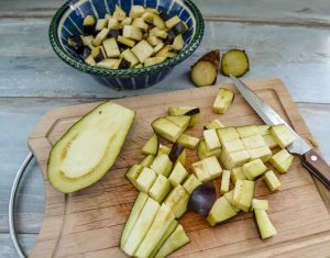 Die Aubergine in Würfel schneiden, wenn du Zeit hast, kannst du sie salzen und 15 Minuten ruhen lassen. Dann müssen die Gemüsewürfel aber kurz unter Wasser abgewaschen werden und mit Küchenkrepp trocken getupft werden.