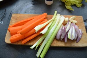die Möhren, Sellerie, Schalotten und Knoblauch schälen und klein würfeln.