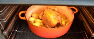 Den Bräter in den auf 180 Grad vorgeheizten Ofen bei Ober- und Unterhitze schieben und ca. 70-80 Minuten schmoren. Ab und zu etwas Wein und Brühe nachfüllen