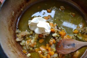 4 El Crème fraîche rühren, mit etwas Salz und dem Piment de Espelette abschmecken.
