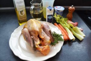 Alle Zutaten bereitstellen, das Perlhuhn gründlich waschen und trocken tupfen