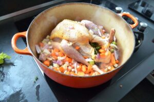 das Perlhuhn in dem Olivenöl und dem Butterschmalz von allen Seiten anbraten und das gewürfelte Gemüse, den Rest Thymian da zu geben