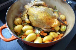 Perlhuhn Rezept mit Drillingen aus dem Ofen. Das leckere saftige Pintade Hühnchen wird mit Kartoffeln, Möhren, Schalotten und Staudensellerie im Backofen in Weißwein und Crème fraîche geschmort.