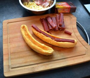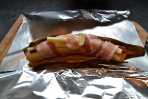 wer es mit Bacon mag was sehr lecker ist umwickelt jede Banane mit 2 Scheiben Bacon . Die Banane in die Schale legen und diese dann in ein Alufolien Körbchen setzen und 10 Minuten backen