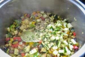 nach ein paar Minuten die gewürfelte Zucchini zu dem Gemüse geben.