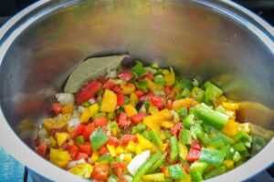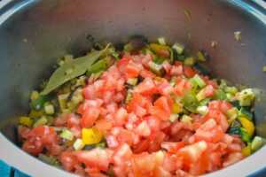 Das Olivenöl erhitzen und die Zwiebeln andünsten, nach 3 Minuten die Paprikawürfel, Knoblauch und das Lorbeerblatt zugeben. Etwas salzen, die Kräuter und das Piment de Espelette oder Chili dazugeben.