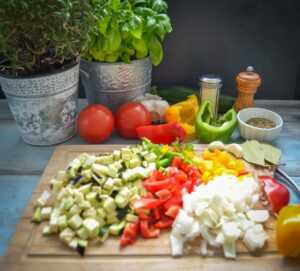 Alle Zutaten bereitstellen, das Gemüse waschen, Zwiebel und Knoblauch schälen und in kleine Würfel schneiden. Die Kräuter hacken und die Tomaten entkernen,