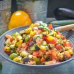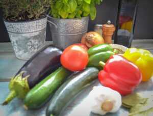 Leckeres sommerliches französisches Ratatouille Rezept. Für das original Ratatouille wird die Paprika, Aubergine, Zucchini, Tomate und Zwiebel gewürfelt. Das mediterrane französische Gemüse passt sehr gut als Beilage zu gegrilltem Fisch und Fleisch oder Baguette und schmeckt warm und kalt sehr gut.