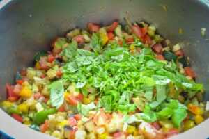 Zum Schluss die Tomaten-Würfel und das geschnittene Basilikum zu dem Rest geben, mit dem Salz nochmal abschmecken.