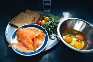Den Räucherlachs würfeln und den Rucola und die Tomaten waschen. Die Eier mit einer Prise Salz würzen und dann mit dem Schneebesen
