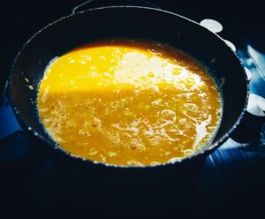 Den Herd ausstellen wenn das Ei noch feucht und etwas flüssig oben drauf ist. Den Herd dann ausstellen und das Rührei in der heißen Pfanne einen Moment ziehen lassen.