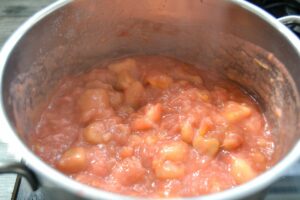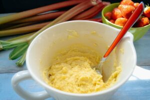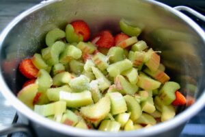 Das Vanillepudding Pulver mit 2 EL Wasser anrühren, den Rhabarber ca. 4 Minuten kochen, er sollte nicht zerfallen und mit dem Puddingpulver binden und vorsichtig verrühren.