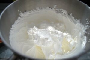 Die Eier trennen und das Eiweiß mit dem Salz und dem Zitronensaft mit dem Mixer aufschlagen. Den Zucker ganz langsam dazugeben und immer weiter schlagen, bis das Eiweiß fest und glänzend ist.