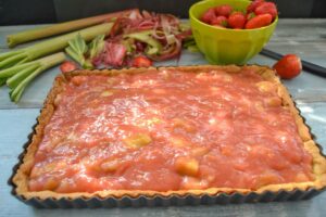 Auf den gebackenen Mürbeteig Mandelboden nun das Rhabarberkompott verteilen und glatt streichen und nur ein paar Erdbeeren dazu geben.