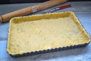 Das Mehl, gemahlenen Mandeln, Salz. Zucker und Vanillezucker vermischen. Die kalte Butter in Stückchen dazugeben und mit dem Ei alles kurz zu einem Teig verkneten. Die Teigkugel ca. 20 Minuten im Kühlschrank kühlen. Den Teig auf Backpapier ausrollen und in eine gefettete Kuchenform geben. Mit einer Gabel einige Löcher in den Teig stechen.