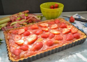 Dieser Rhabarberkuchen mit Baiser und Erdbeeren ist ein besonderer Frühlingskuchen mit knusprigem Mürbeteigboden, fruchtigem Rhabarber-Erdbeer-Kompott und einer luftigen, hellen Baiserhaube. Durch das Blindbacken bleibt der Boden schön mürbe, während die fruchtige Füllung cremig und saftig wird. Der Kuchen eignet sich perfekt fürs Wochenende, wenn man sich etwas Zeit zum Backen nehmen möchte.