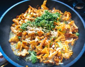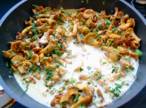 Die Petersilie kleinschneiden und mit der Sahne zu den gebratenen Pfifferlingen geben.