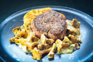 Das Fleisch mit den Beilagen den Pilzen auf dem vorgewärmten Teller anrichten.