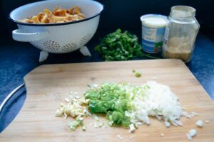 Für die Zubereitung der frischen Pfifferlingen die Pilze sehr gut mit einem Pinsel säubern und die enden abschneiden. Da wir dieses Jahr ein sehr schlechtes Pilzjahr hatten habe ich für dieses Rezept gefrorene Pfifferlinge genommen. Die Zwiebel und die Knoblauchzehe schälen, Lauchzwiebel waschen