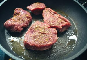 Alle Zutaten für die Zubereitung bereitstellen und den Backofen schon vorheizen. Die Rinderfiletsteak 1-2 Stunden vor dem Braten aus dem Kühlschrank nehmen damit sie Raumtemperatur bekommen. Salz und Pfeffer gebe ich erst nach anbraten dazu damit der Pfeffer nicht verbrennt. Anders als das Churrasco Gewürz.