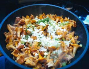 Lauchzwiebel, Knoblauch und Zwiebel in kleine Würfel schneiden. In einer Pfanne etwas Butterschmalz erhitzen und die Pfifferlinge anbraten und mit Salz und Pfeffer würzen. Die Zwiebelwürfel, Lauch und Knoblauch dazu geben