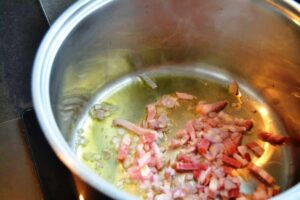 den Bacon anbraten, die Schalotte, Knoblauch und Frühlingszwiebel mit den Pilzen dazu geben und ca. 5 Minuten braten.