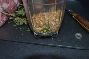 den Senf mit Rosmarin und Thymian und der Knoblauchzehe ganz kurz mixen