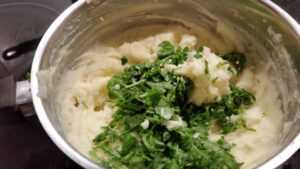 Gewaschenen Rucola in grobe Streifen schneiden und dann mit dem Kartoffelpüree vermischen.