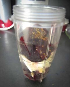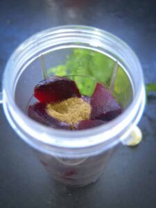 Die Rote Bete etwas zerkleinern, Kreuzkümmel, geschälter Knoblauch, Chiliflocken und Koriander mit den Stielen im Mixer zerkleinern