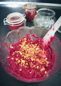 Die Pinienkerne ganz kurz im Mixer zerkleinern oder grob hacken. Es sollten noch Stückchen bleiben. Die Pinienkerne mit dem Kreuzkümmel unter die Rote Bete rühren.