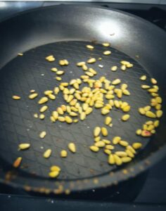 Die Pinienkerne in einer Pfanne ohne Fett leicht rösten, dass sie etwas Farbe bekommen. Da Pinienkerne sehr schnell dunkel werden und verbrennen gut aufpassen.