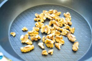 die Walnüsse in einer Pfanne ohne Fett etwas anrösten und dann im Mixer zerkleinern und unter die Rote Beete rühren und mit etwas Salz abschmecken