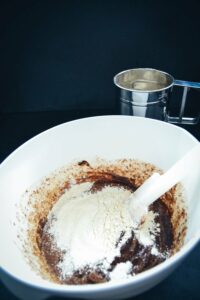 Die Eier kurz aufschlagen und unter die abgekühlte Schokoladen-Creme heben. Am besten geht dies mit einem Spatel.