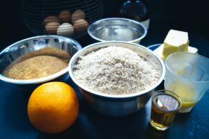 Alle Zutaten bereitstellen, die Orange waschen und Orangenschale abreiben. Die Eier in einem Mixbecher aufschlagen. Sie kommen später in den Teig.