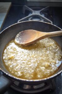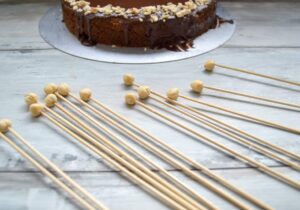 In einer kleinen Pfanne 150 Gramm Zucker schmelzen. Einige Haselnüsse auf einen Holzspieß stecken und dann