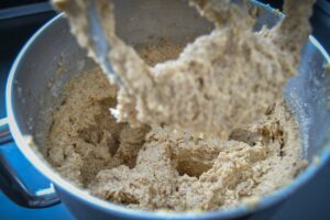 nun die gemahlenen Haselnüsse mit dem Mehl, Orangenschale, Zimt und dem Salz vermischen und mit den verrührten Eier nach und nach unter den Teig rühren.