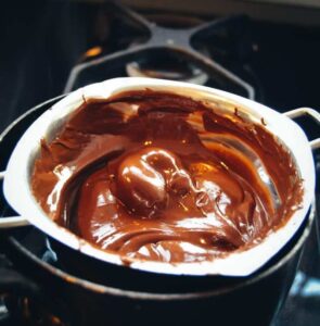 Die Kuvertüre hacken und im Wasserbad bei 55 Grad schmelzen. Oder eine fertige Schokoladen Glasur nach Anweisung erhitzen