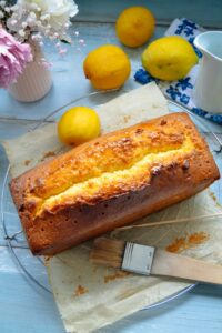 Den Zitronenkuchen mit einem Holzspieß einstechen und dann mit dem abgekühltem Sirup (etwa der Hälfte) den noch heißen Kuchen bestreichen. Durch die kleinen Löcher vom einstechen kann der Sirup gut in den Kuchen ziehen.