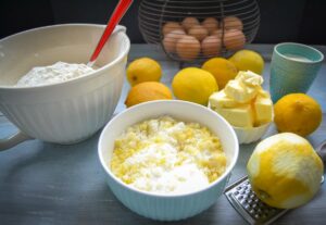 Alle Zutaten, das Mehl, den Zucker und die Butter abwiegen. Die Butter leicht schmelzen, sie sollte sehr weich sein. Die Zitronen gründlich mit warmen Wasser waschen. Dann einen Teil der Schale abreiben. Die restliche Schale mit einem Zestenschneider abschälen, damit man feinere und gröbere Zesten bekommt. Den Zucker mit den Zesten mischen und ca. 20 Minuten ziehen lassen, damit der Zucker das Aroma der Zitrone aufnehmen kann. Das Mehl mit dem Backpulver sieben