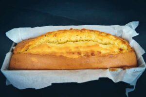 Den Teig in eine mit Backpapier ausgelegte Kastenform füllen. Die Kastenform auf mittlerer Schiene im vorgeheiztem Ofen bei 160 °C Umluft ca.60-65 min backen. Nach ca. 20-25 Minuten mit einem Messer der Länge nach durch Teig schneiden und dann weiter backen