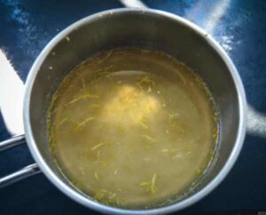 Das Wasser mit dem Zucker mischen und kurz aufkochen lassen vom Herd nehmen den Saft von zwei ausgepressten Zitronen und die Zesten unterrühren